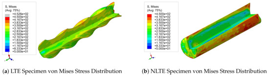 Von Mises stress contours are illustrated in Figure 11a,b for both LTE and NLTE processes. The stress values show an increase from the specimen center to the periphery, and maximum stresses can be observed at the edge of the surfaces. In the case of LTE stress evolution is more heterogeneous and higher stress values are obtained in certain regions. On the contrary, in the NLTE case stress distribution is more homogenous throughout the specimen and high stress values are distributed more homogeneously as well.