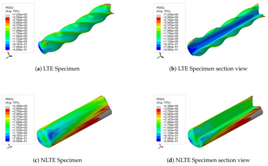 To compare the deformation behavior of LTE and NLTE processes, two typical elements of specimen were chosen at the inner and the outer sections of workpieces distinctively (see e.g., [25,26] for similar representation). The selected elements are highlighted in Figure 5.