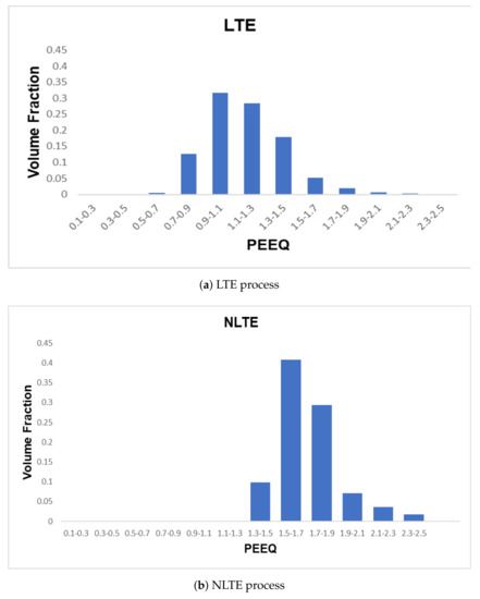 Figure 12 shows the equivalent plastic strain distribution in both LTE and NLTE specimens. In the case of LTE process smaller magnitude of equivalent plastic strain evolves around specimen center and there is a gradual increase from the center to the surface of the specimen. Distinctively, in case of NLTE process equivalent plastic strain evolves uniformly. The Vickers hardness data for the copper specimen which is extruded through both processes is presented in Figure 13. This experimental data proves the plastic deformation evolution on the cross-section in a qualitative way. The situation can be illustrated by using volume fraction histograms in Figure 14 as well. Volume fraction is computed as the number of elements which have the same plastic deformation interval divided by the whole element number of specimen (see e.g., [27]). Histogram shows the volume fraction of each level of plastic strain values. The LTE process has wider distribution of equivalent plastic strain distribution in histogram. On the other hand, the NLTE process has higher fraction at higher equivalent plastic strain value and more uniform distribution of equivalent plastic strain.