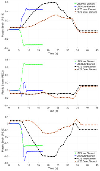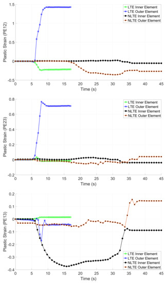 Figure 15 shows the variation of nominal plastic strains at various times during the LTE and NLTE deformation processes for outer and inner elements. The graphics were plotted according to the local coordinate systems for each typical element. In LTE process, tensional normal plastic strain evolves at the outer element in 11 direction, while the inner element shows compressive normal plastic strain. In NLTE process the deformation behavior of inner and outer elements are almost equivalent and the elements have tendency to extend.