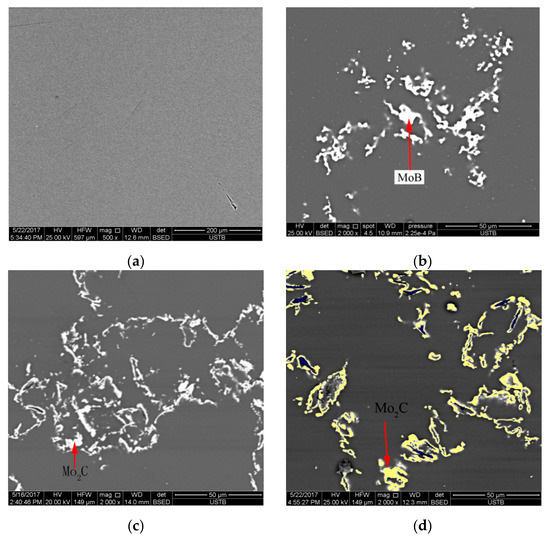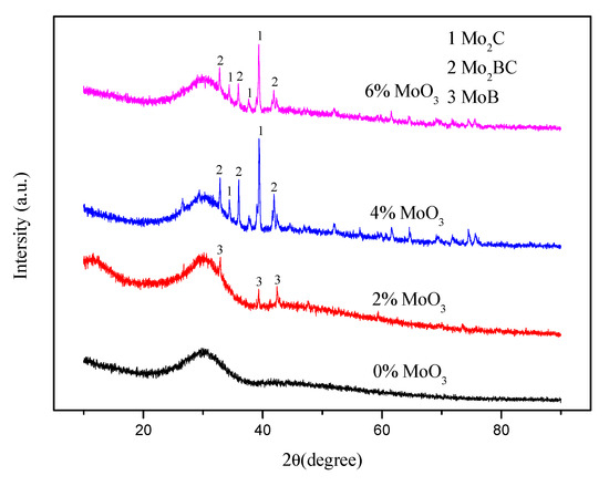 Combining EDS results with the XRD pattern in Figure 2, the particle phases in micrographs could be determined. For the sample with MoO3 = 2%, EDS showed a chemical composition of particles contains B and Mo. XRD confirmed that there was only one crystalline phase, MoB, in the sample with MoO3 = 2%. MoB has a very high melting point of 2873 K [25], and this persisted in a solid state during the melting of mold fluxes. The possible reaction for formation of MoB could be as follows: