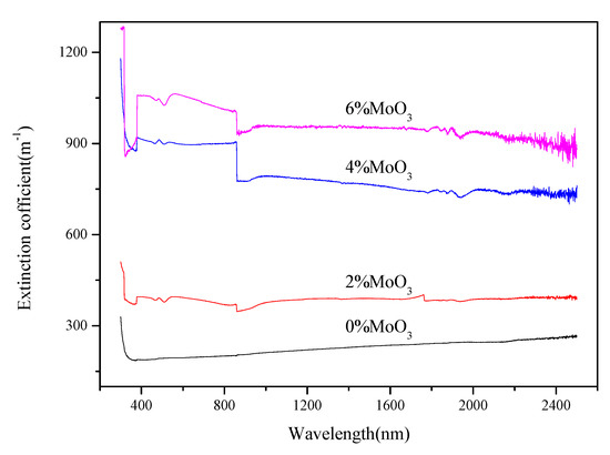 The calculated extinction coefficients of various samples are shown in Figure 4. Strong absorptions below 400 nm were found in all samples, which could be associated with a charge transfer band [10]. There are some new peaks around 400–600, 800–900 and 1600–2000 nm found in samples with MoO3 addition, which could be due to the introduction of MoO3 in the structure of glass [28]. The Mo-free sample had extinction coefficient values between 150 and 300 m−1. The extinction coefficients from the Mo-free sample correspond to the lowest values in the references [23]. This is due to the fact that there were minor transition metal oxides, e.g., Fe2O3, in the composition of glasses reported in the references [23]. The transition metal oxides could increase the apparent absorptivity and decrease the apparent reflectivity, thereby increasing the absorption and extinction coefficients [29]. With the introduction of foreign particles, the extinction coefficients could be enhanced to near 1000 m−1. The extinction coefficients increased with increasing MoO3 content in the samples, indicating that the scattering due to particles was enhanced.