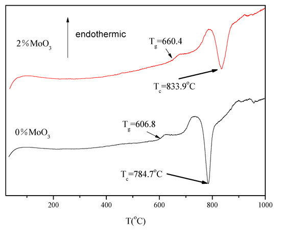 The DSC curves for the powder Mo-free sample and the powder sample with MoO3 = 2% are shown in Figure 5. After the step for glass transition, an exothermic thermal peak could be found in each curve, which was due to the crystallization of the glassy sample. The glass transition temperatures Tg for the Mo-free sample and sample with MoO3 = 2% were obtained as the temperature at half the step height in the DSC curves. The crystallization temperatures of samples Tc were determined as the peak position of the crystallization event. Thermal stability, Tc−Tg, could be employed to measure the crystallization ability of the sample. The larger the Tc−Tg value, the weaker the crystallization ability. The Tc−Tg values for the Mo-free sample and the sample with MoO3 = 2% were 77.9 and 73.5 °C, respectively, which are close to each other. This indicates that the two powder samples have near crystallization ability.