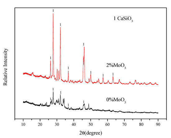 The bulk Mo-free sample and the sample with MoO3 = 2% were heated at the crystallization temperature determined by DSC for 2 h and quenched. The XRD patterns for samples are shown in Figure 6. It could be seen that only one kind of crystal, CaSiO3, precipitated from all glassy samples. The ratios of CaO to SiO2 for all samples were equal to 1. According to the phase diagram of CaO–SiO2–B2O3 [31], the compositions of the present fluxes were within the primary crystal field of CaSiO3. Therefore, the firstly precipitated crystals should be CaSiO3. In our previous work on the crystallization of CaO–SiO2–B2O3 [15], the crystallization product was also CaSiO3, which is in line with the present work. It could be also seen that the crystalline peaks in the XRD pattern of the sample with MoO3 = 2% were much sharper than those of the Mo-free sample. All these indicate that the crystallization of mold fluxes was promoted by the addition of 2% MoO3.