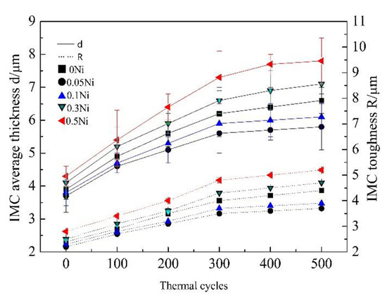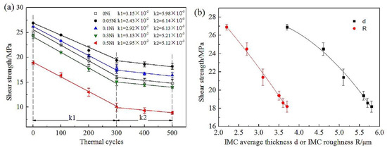 - Guo, X.D.; Zhang, K.K.; Qiu, R.F.; Shi, H.X.; Wang, Y.L.; Ma, N. Effect on interface and property of Sn2.5Ag0.7Cu0.1RExNi/Cu solder joints in severe thermal cycling. Chin. J. Nonferrous. Met. 2016, 26, 2573–2579. (In Chinese) [Google Scholar]