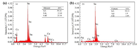 - Cui, J.G.; Zhang, K.K.; Zhao, D.; Ma, N.; Cao, C.C.; Pan, Y.B. Microstructure and properties of Sn2.5Ag0.7Cu0.1RE0.05Ni/Cu solder joints obtained by external energy assisted soldering. Rare Metal. Mat. Eng. 2018, 47, 2800–2806. (In Chinese) [Google Scholar]