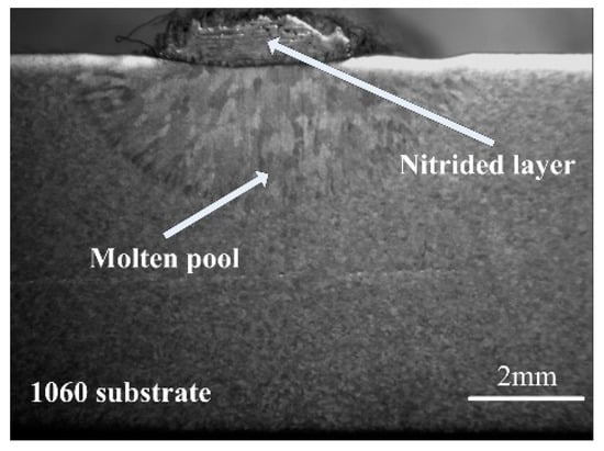 The main equipment was a commercial GTAW welder (Model WP-300, Panasonic, Tangshan, China) and its torch was fixed on an automotive device moving at the given speed. The nitrogen gas and the argon gas were mixed by a mixer which can control the flow rates of each gas. Then the mixed gas was served as the ionizing gas and the shielding gas. The mixed gas flow rate was 10 L/min. The tungsten electrode of the welding torch was about 3 mm above the substrate where the mixed gas was ionized. The direct-current electrode negative (DCEN) polarity was applied, the travel speed was fixed to 2.5 mm/s, and the nitrided layers were prepared by single rows. In order to study the AlN strengthening layer structures on different substrates, nitrided layers were prepared on 1060 and 6082 substrates by a discharge current of 140 A with a nitrogen gas flow rate of 5 L/min. For studying the effects of nitrogen flow rates on nitrided layer structures and properties, nitrided layers were prepared by different nitrogen gas flow rates (1 L/min, 2.5 L/min, 5 L/min, and 7.5 L/min) on 6082 substrates with the discharge current 110 A. The argon gas flow rates are the differences between the mixed gas flow rates and the nitrogen gas flow rates.