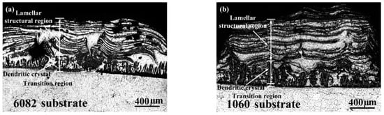 AlN-6082 and AlN-1060 also had quite similar microstructures. Figure 3 are OM photographs of these nitrided layers. As shown in Figure 3, they were both around 1 mm thick, though AlN-6082 was a little thinner than AlN-1060, and they bulged outward from the surfaces of the substrates. Both of these layers were divided into three regions: the lamella (or lamellar structural) region, the dendrite (or dendritic crystal) region, and the transition region. The lamella region was located in the upper and the middle parts of the layer, with thin black lamellae and thick light-grey lamellae alternatively arraying in it. The dendrite region was below the lamella region with several dendrite-like structures in it. The transition region was located below the dendrite region and looked like a dark line adjacent to the substrates. Among these regions, the lamella region was the dominant one both in scale and the effects on properties. In order to show the structural details of these regions, the enlarged views of their microstructures will be discussed below separately.