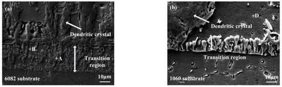 Microstructures of the transition region in different layers are demonstrated in Figure 4. As the pictures show, the microstructures of this region change as substrates vary. In order to identify different phases, EDS was applied on the spots marked in Figure 4, and the results are shown in Table 1. The phases corresponding to the spots (also shown in Table 1) were recognized according to the ratios of N and Al elements, the XRD results above, and the AlN phase diagram []. In these two different layers, the morphologies of AlN changed obviously in the transition region. In that region of AlN-6082, the AlN phase was generated as small particles (spot A) dispersed in Al solid solution (spot B). But in the same region of AlN-1060, the AlN phase was formed as small columnar crystals (spot C) perpendicular to the substrate and surrounded by Al solid solution (spot D). It is worth noting that both of the transition regions on different substrates were constituted by loose and porous structures which Al melt can transfer through.