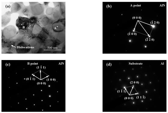 Microstructures of AlN-1060 also have been analyzed by the TEM method. The TEM micrograph and the selected area electron diffraction (SAED) patterns are shown in Figure 6. Figure 6a shows a horizontal section from the bottom part. In this photo, pebble-shaped particles can be seen clearly, which distribute evenly in the light grey substrate with diameters varying from 200 nm to 500 nm. Figure 6b–d shows the SAED patterns of the spots marked in Figure 6a and the substrate. As the patterns show, the substrate was in the α-Al phase, and both A and B points were an h-AlN phase, only different in orientation. The difference in the brightness contrast of AlN particles was due to the change of orientation in Figure 6a. It also shows that some dislocations existed in the Al phase, which indicates the deformation during the nitriding process.