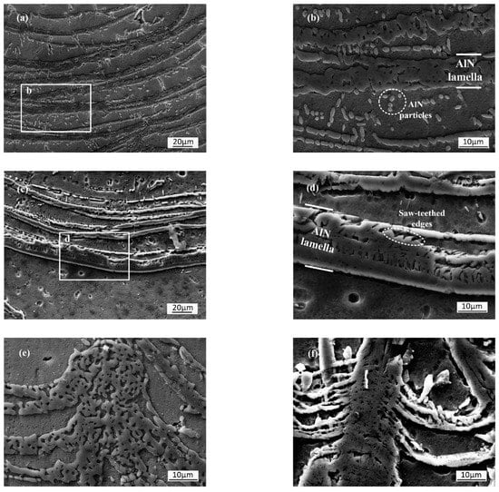 The lamella region is the largest region in the nitrided layer, which was located above the dendrite region. The structures of the lamella region in different nitrided layers are shown in Figure 7. As Figure 7a–d show, the lamella structures were arranged repeatedly in this region. According to the analysis, the thin black lamellae were in AlN phase, while the thick light gray substrate was mainly composed of Al solid solution. Meanwhile, AlN phase could also appear as a dendrite-like structures inserted in the lamellae, as Figure 7e,f shows. This structure was always perpendicular to the substrate, with a number of tiny voids in it. Furthermore, the dendrite-like structure was not a single crystal but was heaped up by many tiny lamellae. This structure also could affect the lamellae nearby and bend them upward.