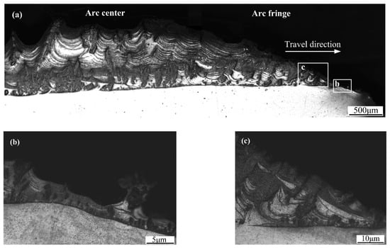 To investigate the formation process of the nitrided layer, a special sample was prepared by a discharge current of 110 A with N2 flow rate of 2.5 L/min. After nitriding, the sample was quenched into water immediately and cut from the end of the nitrided layer against the travel direction. The OM pictures of this section are illustrated in Figure 8.