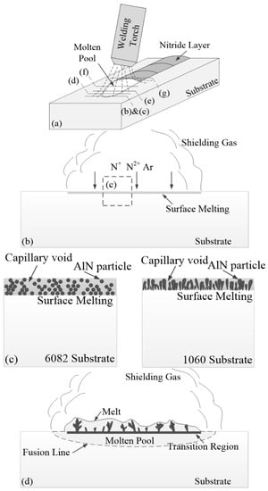 According to the structures shown in Figure 8, a brief nitriding process is demonstrated. At the beginning of the nitriding process, the temperature is low and only the surface of the substrate melts. This extremely thin melt layer interacts with the nitrogen arc to form the transition region []. As the nitriding process goes on, the temperature rises up, the molten pool extends downward, but, hindered by the transition region, N diffusion to this area is not obvious. The melt from the molten pool moves upward through the transition region to the top of the nitrided layer and reacts with the nitrogen plasma. The formed AlN phase maintains a solid state during the whole nitriding process. So, the AlN structure works like the skeleton supporting the whole nitrided layer and generates many small channels where Al melt transfers through. At the final stage of the nitriding process, the temperature drops to the Al melting point, and Al melt in the nitrided layer starts to solidify. In addition, in the molten pool under the nidrided layer, the voids generated by the upward transport of the melt are filled by the melt from the periphery of the molten pool, causing the nitrided layer to be higher than the surface of the substrate, and the molten pool on both sides of the nitrided layer to recess downward. The detailed analysis is also demonstrated below.