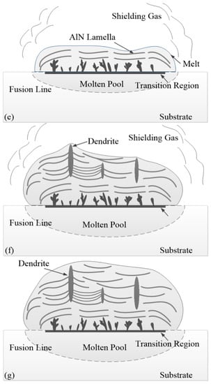 With the movement of the arc, the temperature increases. The surface of the melt is bombarded by the nitrogen plasma, which increases the N concentration of the superficial melt. Once the N concentration exceeds the thermodynamic reaction condition, an AlN lamella structure will be formed on the surface of the melt. The formed lamella has a very loose structure with many cracks and voids, where the melt can transfer. The N concentration of the melt is reduced by the formation of the AlN phase. When the melt submerges this newly born lamella, N concentration cannot meet the needs of the growth of the AlN structure, so a layer of Al melt is left on the layer surface and then the formation of the AlN lamella will repeat. Through the change of N concentration in the melt, the AlN lamella and Al melt layer are repeatedly generated (Figure 9e).