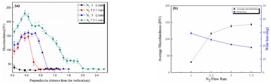 The hardness characters and the wear losses of the nitrided layers are shown in Figure 11. Figure 11a demonstrates the microhardness curves of different layers. The strengthening layer is composed of the AlN phase and Al phase, so the hardness of the layer is determined by the distributions and characters of both phases, especially the ratios of the AlN phase to the total material. When N2 flow rate is 1 L/min, the enhancement is not obvious due to the poor thickness of the nitrided layer. With the increase of N2 flow rate, the average hardness of the layer is improved. When the N2 flow rate is 7.5 L/min, the average hardness is nearly 7 times as that of the substrate. Excluding the curve of N2 flow rate 1 L/min, these hardness curves bend upward in the middle, which means that the hardness increases firstly to a maximum, and then drops down. This phenomenon is caused by the distribution of the AlN phase: during the formation of the bottom and the top parts, the melt layer is farther away from the arc center, which leads to the shortage of N element (compared to the middle part which is formed just under the center of the ionized gas), which causes a scarcity of AlN in these parts. By analyzing hardness curves and the structures of the layers, it was found that the dendrite-like AlN structure in the lamella region had the main influence on improving the average hardness. So, a bigger N2 flow rate should be used to get a harder nitrided layer.