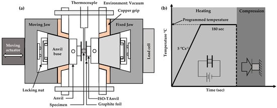 (a) Schematic of the Gleeble hot compression testing setup with thermocouples welded to the specimen; (b) heating and compression cycle used in the study.