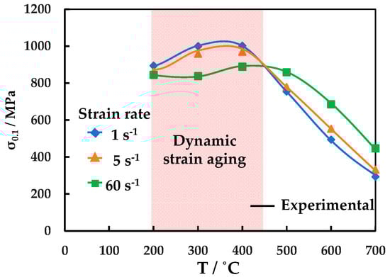Figure 4 shows the flow stress variation at a strain of 0.1 for varying temperatures and strain rates. The flow stress at a strain of 0.1 is chosen to avoid the transient conditions present during the early stages of loading. It is in order to mention that serrated flow was observed in some of the stress-strain curves. To obtain the true stress value at a plastic strain of 0.1 consistently, the experimental data points are fitted using a 6th order polynomial with strain as a variable. This procedure is carried out to remove the undulations due to serrated flow. This is the reason for the minor variations in the true stress at a strain of 0.1 (σ0.1) in Figures 4, 6, and 7 from the true stress at a strain of 0.1 (σ0.1) in Figure 3. Figure 4 shows the flow stress variation in the two temperature zones of 200–400 °C and 500–700 °C. The flow stress increases in the temperature zone 200–400 °C and decreases with further temperature increase in the temperature zone 500–700 °C. At strain rates 1 s−1 and 5 s−1, the flow stress increases in the temperature zone 200–400 °C. On the other hand, at the strain rate of 60 s−1, the flow stress decreases marginally from 200 °C to 300 °C and slightly increases from 300 °C to 400 °C.