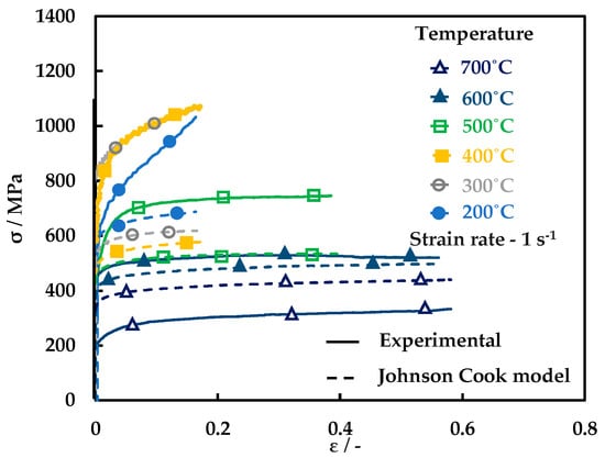 In this approach, each component of the J-C model is not separately calibrated whereas in the well-established methodology for the fitting of the J-C model each of its component is separately calibrated. The values obtained in Table 2 are comparable to the values obtained in [8] used extensively in the modeling of chip formation in the machining process. This confirms the accuracy of the internally developed genetic algorithm-based optimization routine used to predict the J-C model parameters. Figure 5 shows the flow stress curves predicted using the original J-C model parameters in Table 2 along with the experimentally obtained flow stress curves at a strain rate of 1 s−1. The strain, strain rate and temperature values measured during the compression tests are used to calculate the corresponding stress values using the original J-C model. Hence the strain rate values and temperature values are not constant in the graphs provided in Figure 5. Figure 5 shows that the original J-C model fits poorly the experimental flow stress curves.