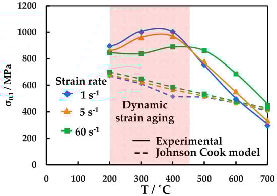 - Two temperature zones were identified with different flow behavior where the flow stress increased with temperature in the temperature zone (200–400 °C) and the flow stress decreased with temperature in the temperature zone (500–700 °C).
