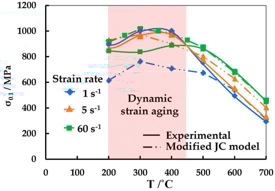 Flow stress at a true plastic strain of 0.1 versus temperature modeled using the modified J-C model.