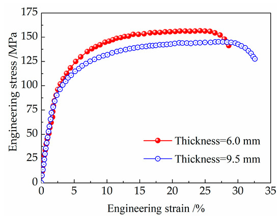 The as-received sheet materials used in this investigation were 2219 aluminum alloy sheets in an annealed state. It was an aluminum-copper alloy with the composition of 5.8–6.8 wt.% Cu, 0.2–0.4 wt.% Mn, ≤0.2 wt.% Si, 0.10–0.25 wt.% Zr, ≤0.3 wt.% Fe, ≤0.02 wt.% Mg, 0.1 wt.% Zn, 0.05–0.15 wt.% V, 0.02–0.10 wt.% Ti, and balance Al. Their nominal thicknesses were 6.0 mm and 9.5 mm, respectively. The uniaxial tensile tests were conducted on a universal material testing machine along the rolling direction of the two types of sheet materials. Their engineering stress-strain curves are presented in Figure 1, and the corresponding mechanical parameters are listed in Table 1.
