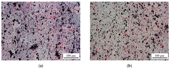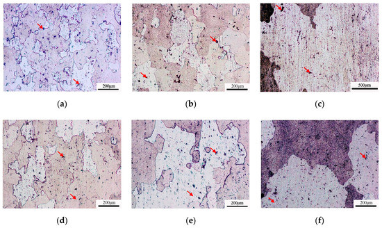 Figure 2 shows the initial metallographic structure of the 2219 aluminum alloy sheets with different thicknesses. There are many black spots, as identified by the red arrows, which may be produced during the chemical etching process at the position of porosity or second phase. In spite of this, the grain boundary is clearly visible for the measurement of the average grain sizes, which were not affected by the black spots. Therefore, their average grain sizes were measured from Figure 2 using the intercept line method. It was calculated that the 6.0 mm thick 2219 aluminum alloy sheet had an average grain size of 57 μm while the 9.5 mm thick sheet had an average grain size of 100 μm. It was found that the average grain size of the two kinds of 2219 aluminum alloy sheets was less than 100 μm, which means they are fine grain materials. Moreover, it was seen that the average grain size of the 9.5 mm thick sheet was bigger than that of the 6.0 mm thick sheet, which may be related to the rolling process.