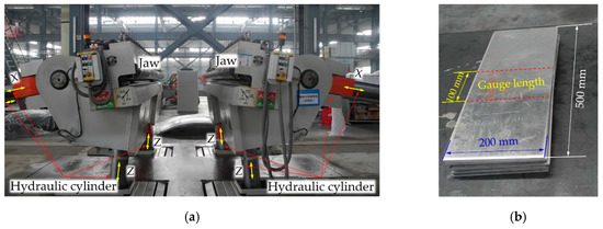 Figure 3 shows the CNC (Computerized Numerical Control) sheet stretch forming equipment used for the stretching deformation and the 2219 aluminum alloy sheet specimens. This is the FET-1500 stretch forming machine manufactured by the Alstom-ACB (Nantes, France), and continuous stretch forming action is available on it. The clamping motion device of the stretch forming machine consists of two jaws and respective four telescopic hydraulic cylinders. In the stretching process, the sheet was gripped between the two jaws and was stretched with the combined movement of the hydraulic cylinders according to the predetermined trajectory. The maximum vertical tensile force of the machine is 15,000 kN, and the maximum horizontal tensile force is 7500 kN. Moreover, a sheet with maximum size of 6000 mm × 4000 mm can be stretched using this equipment.