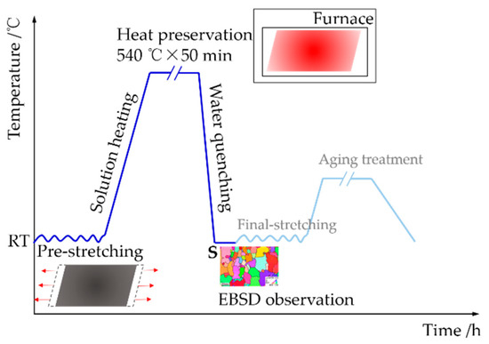 In stretch forming, a two-pass stretching process was often applied on the 2219 aluminum alloy sheets at room temperature, as shown in Figure 4. The specific experimental process is as follows: (1) pre-stretching in the annealed state; (2) solution heat treatment; (3) final-stretching; (4) aging treatment. In this investigation, the annealed 2219 aluminum alloy sheet was first pre-stretched with different deformation amounts at room temperature using the CNC sheet stretch forming equipment. The initial size of 2219 aluminum alloy sheet samples was 500 mm × 200 mm, as shown in Figure 3b. The pre-stretching deformation of the 100 mm gauge length was 3%, 4% and 5%, respectively. After pre-stretching, the deformed samples were heated in an air circulation quenching furnace for the solution heat treatment. The solution temperature and time were selected as 540 °C and 50 min, respectively. Finally, the 2219 sheet samples were taken out from the furnace quickly and were quenched in water in order to preserve the supersaturated solid solution.