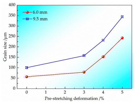 Dependence of grain size on pre-deformation for the two kinds of sheets with thicknesses of 6.0 mm and 9.5 mm.