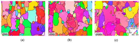 In order to further characterize the effect of pre-deformation on the grain structure and orientation changing in solution heat treatment, EBSD observations were carried out on the 2219 aluminum alloy samples with initial thickness of 9.5 mm, as shown in Figure 7. From the EBSD data, the [001] inverse pole figures (IPFs) were calculated to describe the grain structure. The IPF map was a color-coded map where the color gave an indication of the crystal direction aligned with the normal direction (ND) of the sample. Different colors represented different orientations of the grains. The high angle grain boundaries (HAGBs, >15°) were shown in black. The low angle grain boundaries (LAGBs) including 2–5° and 5–15°, were shown in white and blue, respectively. The grains indexed by EBSD are the regions enclosed by HAGBs. The results obtained were similar to the metallographic observation. It was shown from Figure 7 that there was no obvious change of grain structure when the pre-deformation was increased to 3%. After the pre-deformation was raised to 5%, the grain grew up obviously. The corresponding average grain area was 104.4% higher than the sample without pre-deformation. Meanwhile, the LAGBs almost disappeared, which illustrated that the static recovery and recrystallization occurred in the solution heat treatment.