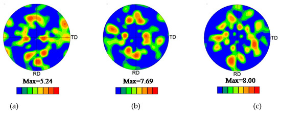 The pole figure (PF) was calculated to describe the grain orientation evolution, which could show the distinct texture components. The volume fraction of typical texture components was calculated with a widely used tolerance of 15°. It should be noted that the texture typically develops around brass {110}<112>, S {123}<634> and copper {112}<111> orientations during the rolling process, and around cube {100}<001> and Goss {110}<001> orientations during the annealing process [21,22]. Figure 8 shows the {111} PFs illustrating the texture evolution with increasing pre-deformation degree. It is shown that the orientation distribution was relatively random, accompanying weak near-Goss and copper textures. The pre-deformation had little influence on the orientation distribution due to the static recovery and recrystallization caused during solution heat treatment. In order to clearly show the effect of pre-deformation on the change of texture, orientation distribution functions (ODF) are also given in Figure 9. The orientation distribution in the un-deformed sample after solution treatment was similar to the texture distribution of as-received material in the annealing state. As the pre-deformation degree was increased to 5%, some near-copper texture {112}<111> was generated during the stretching and subsequent solution heat treatment processes (Figure 9b).