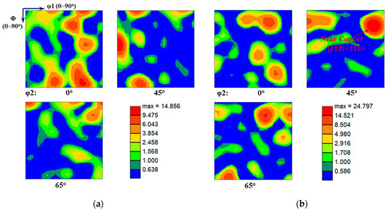 Orientation distribution functions of the 9.5 mm thick 2219 aluminum alloy sheet for un-deformed and 5% pre-stretched samples: (a) 0%; (b) 5%.