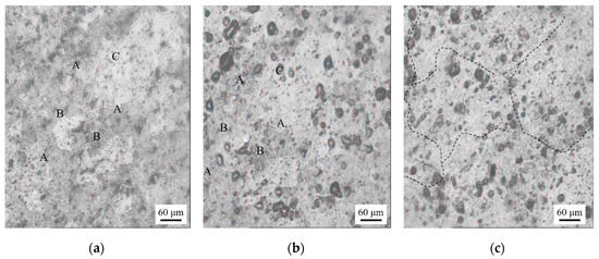 In order to further reveal the grain growth mechanism of the 2219 aluminum alloy sheets, in situ metallographic microscopy observation at elevated temperature was carried out. A sample with a pre-stretching deformation degree of 5% was sliced into 0.3 mm, polished and placed on the heating table of a high temperature metallographic microscope. The sample was heated to 535 °C at a heating rate of 10 °C/min. Figure 11 shows the metallographic structure evolution of three typical regions including A, B and C. Among them, region A contained many fine grains, region B had relatively coarse grains and region C had very coarse grains. It can be found that the phenomenon of grain growth was not obvious during the heating process, which exhibited the similar metallographic structure. After the temperature reached 535 °C, especially when soaking time was adopted at 6 min, obvious grain growth was caused. It illustrates that enough stored energy was produced, resulting in the grain coarsening.