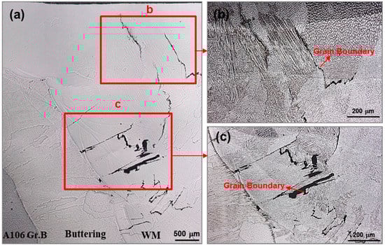Figure 3 shows the microstructure of the cracks formed in the butt welds. Figure 3a was a picture combined with several OM pictures showing the buttering and the WM. Figure 3a was taken before etching. As shown in Figure 3b, the cracks were formed along the grain boundaries. Figure 3c also shows that cracks occurred along the grain boundary and propagated to the fusion boundary between the buttering and the WM.