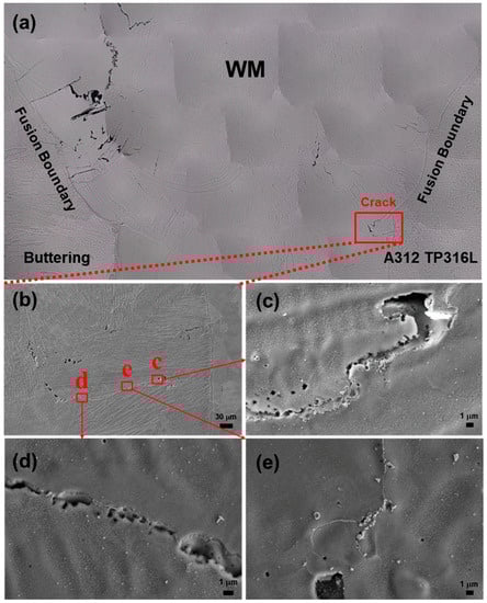 In order to investigate the cracks, SEM was used as shown in Figure 4. Figure 4a is a combined picture of several OM pictures. Figure 4b shows the cracks similar to those shown in Figure 3. Although the size of the cracks near A312 TP316L was smaller than the size of the cracks near the buttering fusion boundary, the common thing is that the crack occurred along the grain boundary as well. Figure 4c–e are SEM photographs with high magnification compared to Figure 4b. As shown in Figure 4c, it is observed that a segregation band exists along the crack surface. Figure 4c,d show the 1-μm-sized precipitates and voids produced along the grain boundary. The voids are connected with a crack. In Figure 4e, voids and fine precipitates were observed near cracks as well.