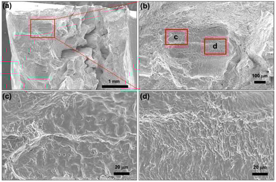 (a) SEM fractography of the crack surface; (b) Enlarged fractography of marked area in (a); (c,d) Enlarged fractographies of marked area in (b).