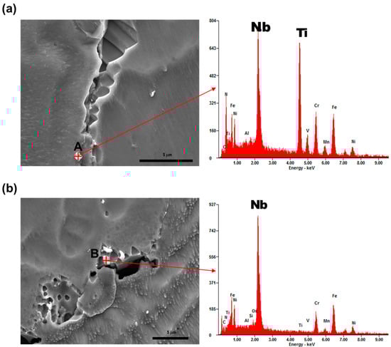 Figure 7 shows SEM micrographs and EDS spectra of the precipitates found near the crack in the WM. The weld pool was solidified below solidus temperature due to constitutional super cooling. This causes segregation, which formed precipitates in the inter-dendritic region [26]. As shown in Figure 7a, blocky precipitates were observed. At point A in Figure 7a, the chemical components of Nb, Ti, and C were most abundant except for that of Fe, Ni, and Cr, which are major components of the matrix, as shown in Table 4. The peak of N in EDS resulted from the nitric acid of the etchant because all the materials in this study have no nitrogen. The results of SEM-EDS analysis for the precipitates found in the voids are shown in Figure 7b and Table 5. At point B in Figure 7b, the chemical components of Nb and C were most abundant except for that of Fe, Ni, Cr, which are major components of the matrix, as shown in Table 5.