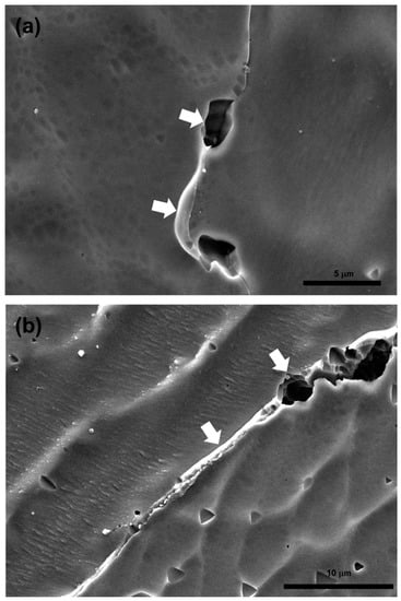 Figure 5 shows fractographies of the crack surface. Figure 5b shows an enlarged photograph of the area marked with a rectangular inset of Figure 5a. Figure 5c,d shows the enlarged area depicted in Figure 5b. Figure 5c,d show the smooth crack surface which is the typical shape of liquidation crack [21]. Dimples which can be often seen in ductile fracture were not observed.