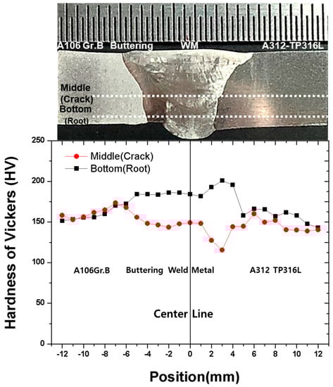 Vickers hardness were measured at 1 mm intervals on middle and bottom parts in the BM, buttering, and the WM, respectively, as shown in Figure 9. The measured Vickers hardness was from 115 HV to 201 HV. The lowest hardness was measured at the location where cracks were formed in 3 mm of the middle part as depicted in the upper specimen picture of Figure 3. The maximum hardness at the bottom part was shown in the HAZ of the A312 TP316L base metal. The maximum hardness at the middle part (cracked part) was shown in the HAZ of A106Gr.B base metal. In the weldment, the hardness of the bottom part was higher than that of the middle part. The reason for the higher hardness of the weldment in the bottom part is that the cooling rate in the bottom part was faster than that in the middle part.