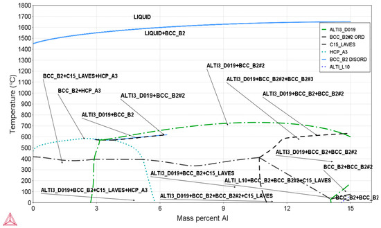Figure 1 shows the phase diagram of one of the candidate alloys from our dataset (Ti88.34-Al11.15-Cr0.4-V0.11 in wt. %. with Cr fixed at 0.4 wt. % and V fixed at 0.11 wt. %.) where aluminum concentration was allowed to vary, while titanium adds up to the balance. In Figure 1, it can be observed that, apart from HCP_A3 (α) and BCC_B2 (β), there exist several other phases such as titanium aluminides, like TI3AL_D019, TIAL_L10, and C15_LAVES. Even BCC_B2 (β) exists in two forms—ordered and disordered phase—on the phase diagram. We have stated the notations that we observed from Thermo-Calc Software [15]. In Thermo-Calc, while plotting the figures, if we chose “ordering”, we get it displayed on the phase diagram. During equilibrium calculations, we observed B2 phase in two forms: BCC_B2 and BCC_B2#2. Thus, we used these notations so that readers can easily follow the phases that were mentioned from the Thermo-Calc Software manual.