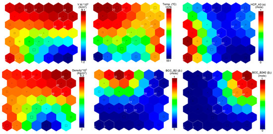 As mentioned in the previous section, we will focus on α and β-phases only, as we are dealing with a (α + β) system. Hence, we will only briefly discuss undesirable phases, such as titanium aluminide and Laves phases shown in Figure 3, where one of the key findings is the appearance of liquid phase at intermediate to high temperatures. An experimentalist must avoid the alloy compositions which can have liquid phase at temperature of application. Another observation is that these titanium aluminide phases are present in large number of candidate alloys that were not part of the original Pareto optimized set. Hexagonal units 7, 23, 24, and 30 in the SOM map shown in Figure 4 contain one candidate alloy each. The rest of the hexagonal units do not contain candidate alloys that were part of the original Pareto-optimized set of alloys where the amount of these titanium aluminide phases was stable in comparatively large amounts. This shows the efficacy of application of multiobjective design optimization combined with the SOM analysis.