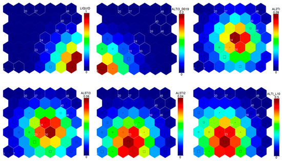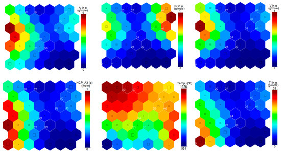 In the original dataset [12] of 104 Pareto-optimized Ti–Al–Cr–V candidate alloys, there were four candidate alloys with different compositions for temperatures of 30, 200, 400, 600, 800, and 1000 °C, while there were 20 candidate alloys with different compositions for each of the high temperatures (1200, 1300, 1400, and 1500 °C). Thus, there were 24 candidate alloys for temperatures below 1000 °C, and 80 candidate alloys for temperatures above 1000 °C. Two candidate alloys were removed from the original dataset [12] as it was difficult to find equilibrium, thus, resulting in the final set of 102 Pareto-optimized candidate alloys that were then analyzed using SOM. Based on temperature, there were lower number of alloys below 1000 °C. As a result, candidate alloys for which calculations were performed below 600 °C became part of the hexagonal unit 0 in the SOM temperature map.