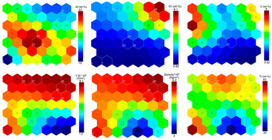Unit 48 also contains alloys with the highest Young’s modulus and density and they decrease in the adjacent units. Even in Figure 4, hexagonal unit 48 contains alloys with highest amount of chromium, which decreases in the adjacent units, while it contains low amounts of aluminum, which increases in the adjacent units. Thus, a correlation can be drawn between the alloy composition (chromium content), stability of BCC_B2#2 (β2) phase, phase composition (maximum chromium and vanadium in BCC_B2#2 (β2) phase) and Young’s modulus and density (highest) at an average temperature in unit 48. Additionally, the decrease of Young’s modulus and decrease in density can be observed with change in alloy composition and phase composition in the adjacent units.