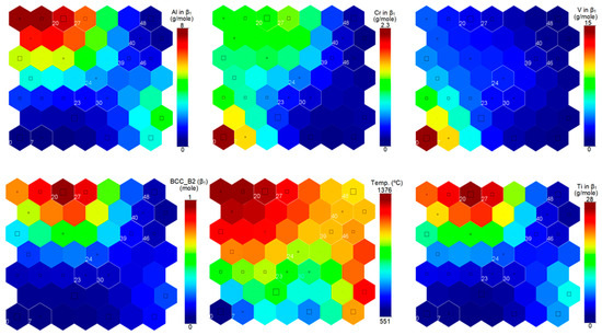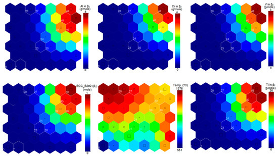 Figure 7 shows the concentrations of alloying elements in BCC_B2#2 (β2) phase. Hexagonal unit 48 contains candidate alloys with the highest amount of BCC_B2#2 (β2). Temperature in this region is in the average range, while Young’s modulus and density are the highest for this unit (Figure 4). From Figure 7, it can be observed that unit 48 contains the highest amount of chromium and vanadium (β-stabilizers) in BCC_B2#2 (β2) phase and their contents decrease in the adjacent units.