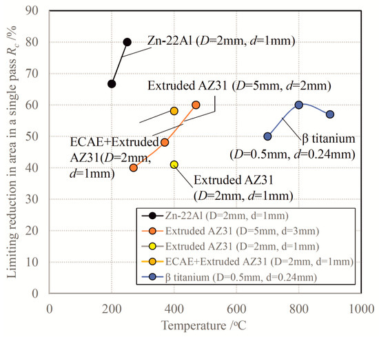 Effect of the heating temperature on the limiting reduction in the cross-section area (D, outer tube diameter; d, inner tube diameter; ECAE, equal channel angular extrusion). Republished with permission of Trans Tech Publications, from reference [23], copyright 2016; permission conveyed through Copyright Clearance Center, Inc.