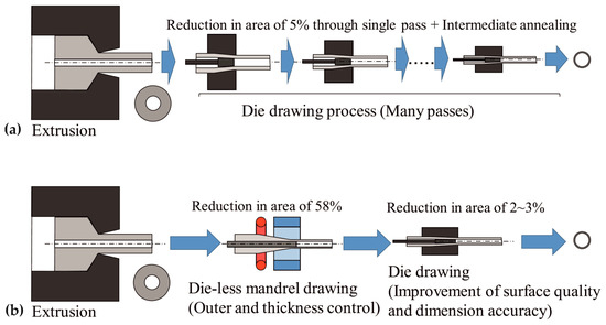 Conceptual illustration for the mass production of magnesium alloy micro-tubes, with an improved accuracy and quality: (a) conventional manufacturing process die drawing and (b) proposed manufacturing process using dieless mandrel drawing. Reprinted from reference [21], copyright 2018, with permission from Elsevier.
