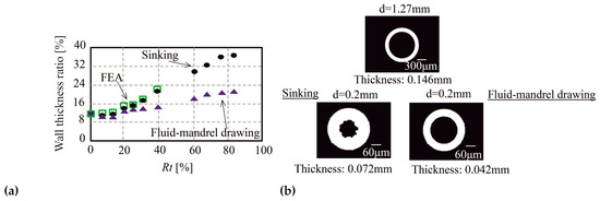 Comparison of fluid-mandrel drawing and sinking: (a) development of the wall thickness ratio versus the ratio Rt of the reduction of the outer tube diameter and (b) the cross-section shapes of the initial tube (above) and the drawn micro-tubes (below). Republished with the permission of Trans Tech Publications, from reference [43], copyright 2014; permission conveyed through Copyright Clearance Center, Inc.