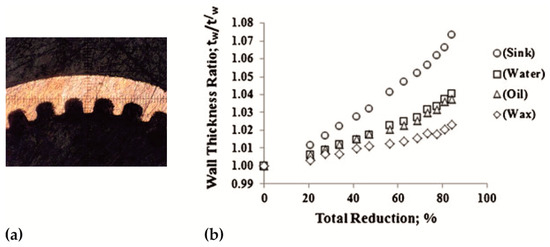 Fluid-mandrel drawing of grooved micro-tubes: (a) cross-section of the initial tube made from copper, with do = 5 mm and t = 364 µm, and (b) the development of the wall thickness ratio versus the total reduction area for different drawing media. Reprinted with permission from Springer Nature, reference [49], copyright 2014.