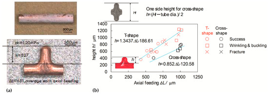 Micro-hydroforming of tubes made from copper: (a) the forming result, using fluorocarbon spray as a lubricant, and (b) the relation between the protrusion height and the axial feeding. Reprinted from reference [70], copyright 2017, with permission from Elsevier.