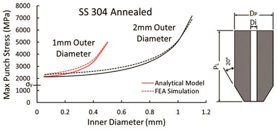 Maximum punch stress as a function of the inner punch diameter Di for the micro-hydroforming of stainless-steel tubes with different tube outer diameters. Reprinted with the permission of SAGE Publications, Ltd., from reference [86], copyright 2018.
